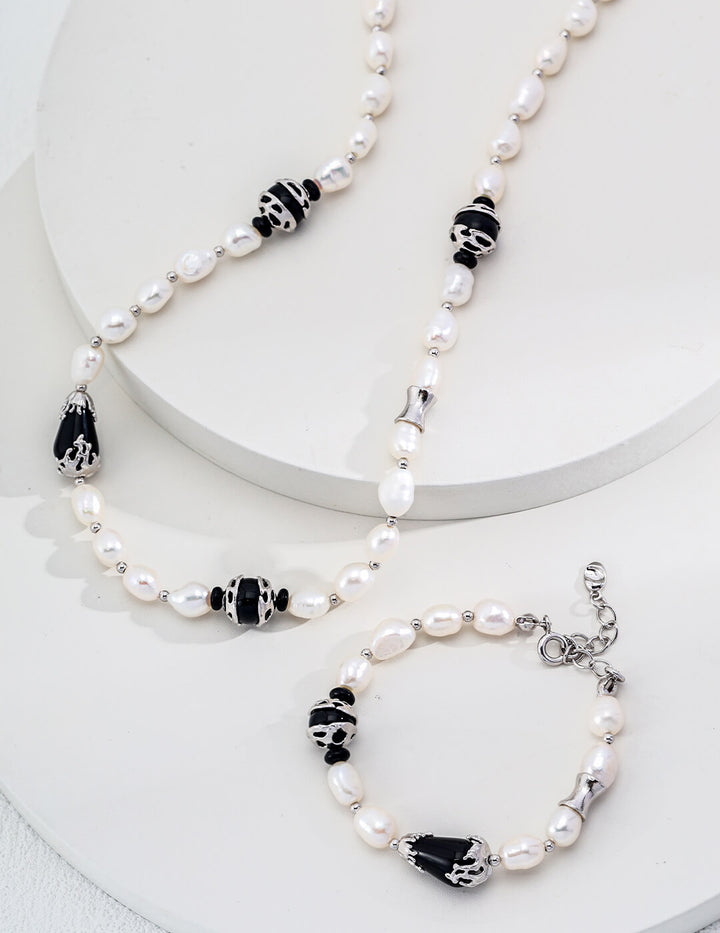 Bohemian 925 Sterling Silver Necklace/Bracelet with Natural Pearl & Black Onyx – Adjustable Vintage Jewelry for Spiritual Elegance