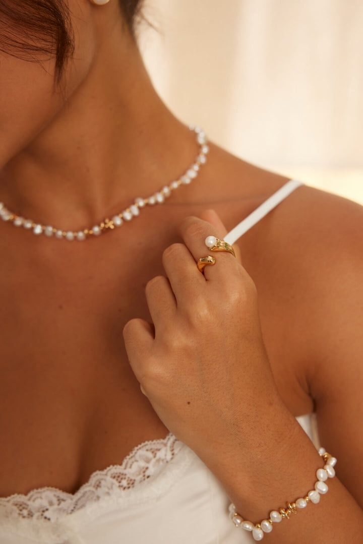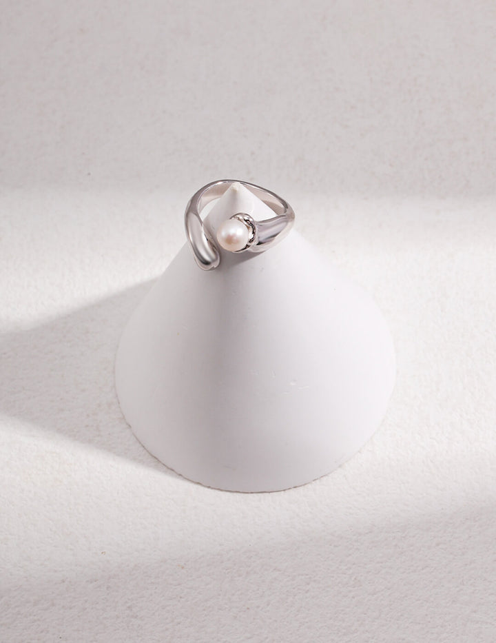 Liquid Silver & Moonlit Pearl Ring – Organic Elegance in Adjustable S925 Sterling Silver (11-15 Size, 6mm Freshwater Pearl)