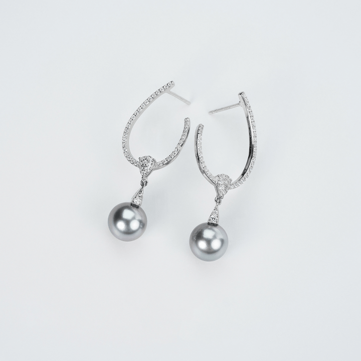 Luxury Tahitian Pearl Earrings in Platinum Gray – 925 Sterling Silver Fluid Curve Design for Timeless Elegance