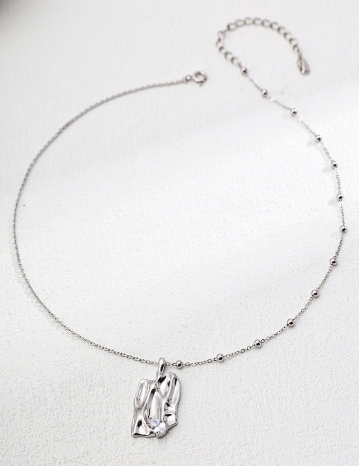 Organic Textured 925 Sterling Silver Pendant Necklace – Handcrafted Bark-Inspired Design with Zircon Accents
