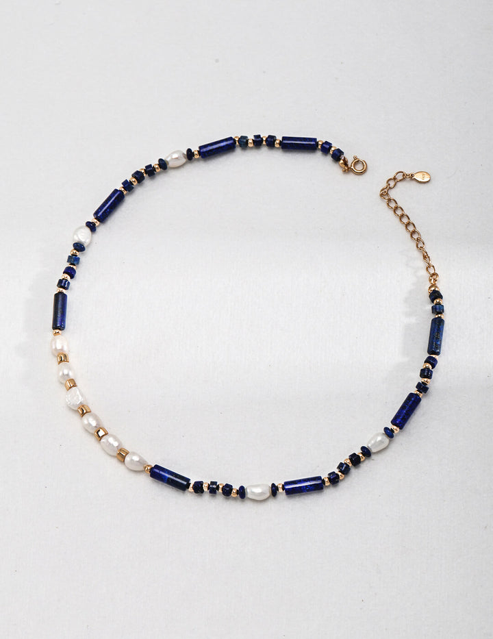 Unisex Vintage 925 Sterling Silver Necklace with Lapis Lazuli & Natural Pearl – Adjustable 36+5cm Boho-Chain for Bold Stacking